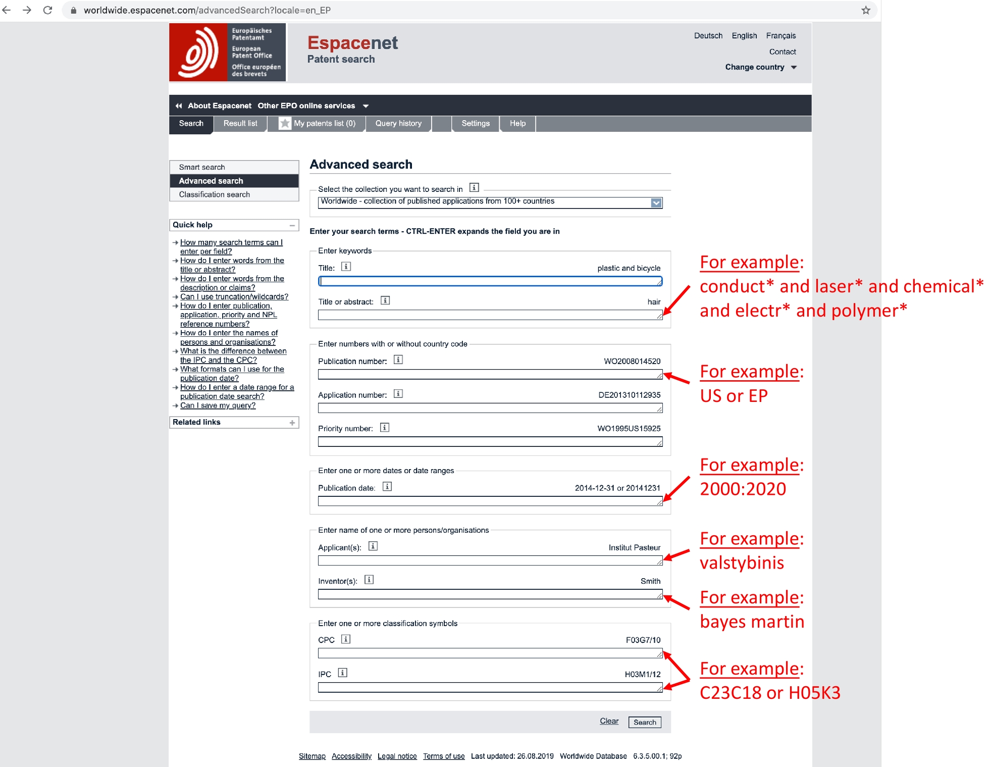 Greitai paieškai siūloma naudoti „Espacenet“ išmaniąją paiešką (Smart search). Šis būdas patogus, kai žinomas tikslus patento numeris arba pareiškėjo vardas. Norint atlikti išsamesnę paiešką, rekomenduojama naudoti išplėstinę paiešką (Advanced search).